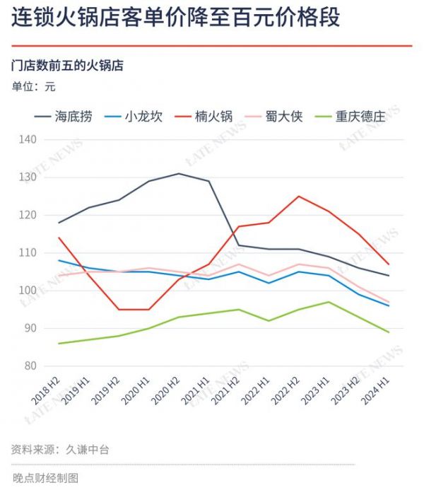 一份券商纪要显示,今年上半年,海底捞客单价再次落入百元。另据久谦中台数据,蜀大侠、谭鸭血的客单价也降至百元内。主打高端的怂火锅从去年同期的 150 元滑到 109 元,已经比较便宜的凑凑火锅,客单价又低了 11 元。