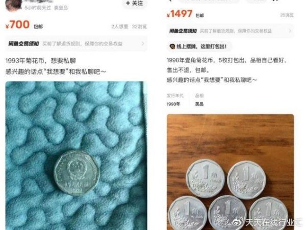 又有用户爆料称,闲鱼上存在不少硬币交易,通过硬币+年份隐晦地传递色情信息,开展涉黄交易。更“狂野”的是,这种交易甚至不限于男女之间,令人惊掉了下巴。而据天眼查核实,平台上也确实挂上了一些奇怪的菊花1角硬币,标价为几百元到一千多元不等,而正常的价格体系下,除了2000年的散币能卖到几百元,其他的一般都只值几毛钱,可见闲鱼上的这些“菊花硬币”背后大有问题。