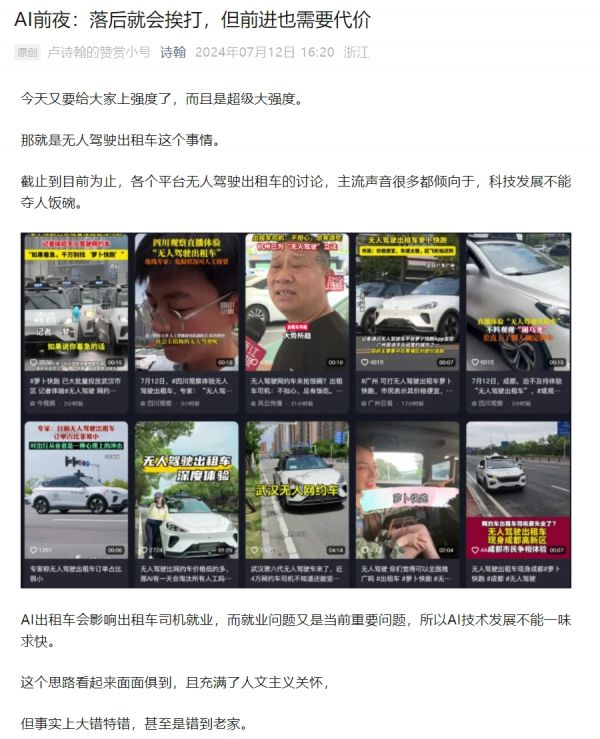 前段时间,我写了一篇关于AI对出租车市场冲击的文章,被许多媒体转载,争议也特别激烈,很多人觉得你是站着说话不腰疼,进步确实要代价,但如果石块砸到你头上还能这么说吗?