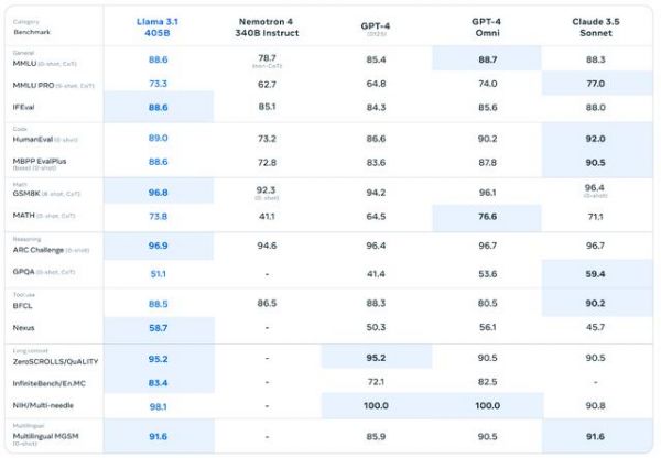 据介绍,在150多个基准测试集中,Llama 3.1 405B版本的表现基本追平甚至超越了此前最强闭源模型GPT-4o和Claude 3.5 Sonnet,而参数较小的8B和70B模型也能够与谷歌、Mistral AI以及OpenAI旗下参数相似的各大模型相媲美。