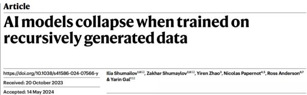 相关研究论文以“AI models collapse when trained on recursively generated data”为题,已发表在权威科学期刊 Nature 上。