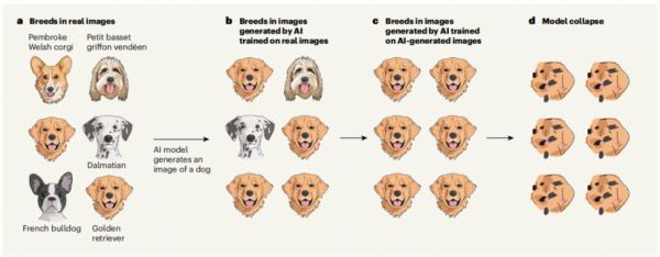 想象一下一个生成 AI 模型负责生成狗的图像。AI 模型会倾向于重现训练数据中最常见的狗的品种,因此可能会过多地呈现金毛,而非法斗。如果随后的模型在一个 AI 生成的数据集中进行训练,而这个数据集中过多地呈现了金毛,这个问题就会加剧。经过足够多轮次的过多呈现金毛后,模型将忘记诸如法斗这样的冷门品种的存在,只生成金毛的图像。最终,模型将崩溃,无法生成有意义的内容。