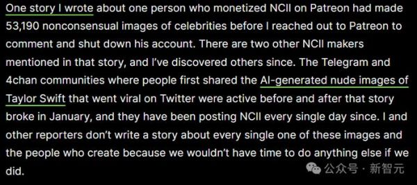 泰勒·斯威夫特在推特上疯传的人工智能生成的裸体图片就是在Telegram和4chan社区首次分享的,在一月份那篇报道爆出前后,这些社区都很活跃,从那以后,他们每天都在发布NCII。