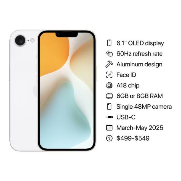 根据此前的爆料称,iPhone SE 4将采用6.06英寸全面屏,支持Face ID功能,搭配苹果最新的A18芯片,支持Apple Intelligence,并且配备USB-C数据口。