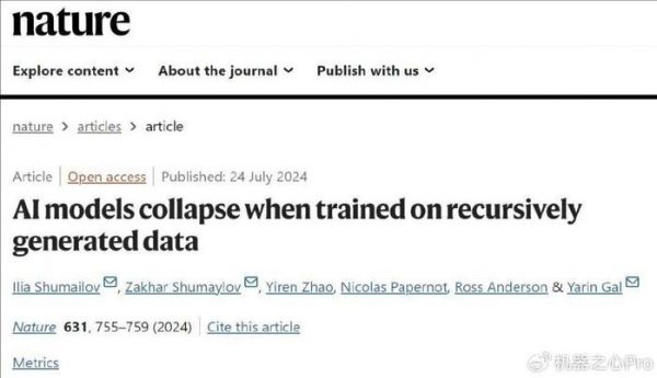 今天发表在学术顶刊《自然》杂志的封面研究认为,如果放任大模型用自动生成的数据训练自己,AI 可能会自我退化,在短短几代内将原始内容迭代成无法挽回的胡言乱语。