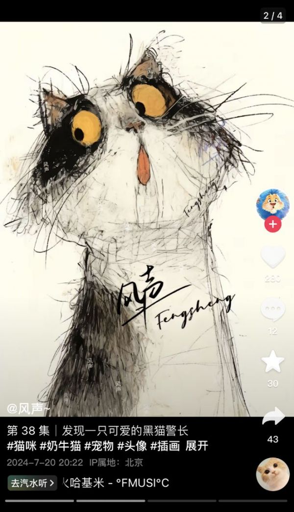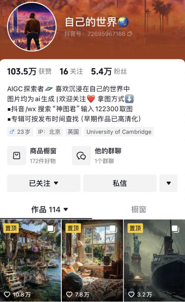 博主“自己的世界”本身就在国外学交互设计,日常也会接触AI方面的设计内容,今年年初便创建了一个抖音账号开始发布自己的练习作品——通过AI生成的比较有想象力、能够提供情绪价值的图片。