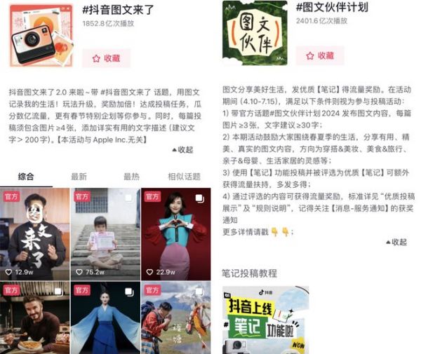 在博主们添加的话题中,常有“抖音图文来了”“图文伙伴计划”等活动tag——背后目的是吃到平台的流量扶持。