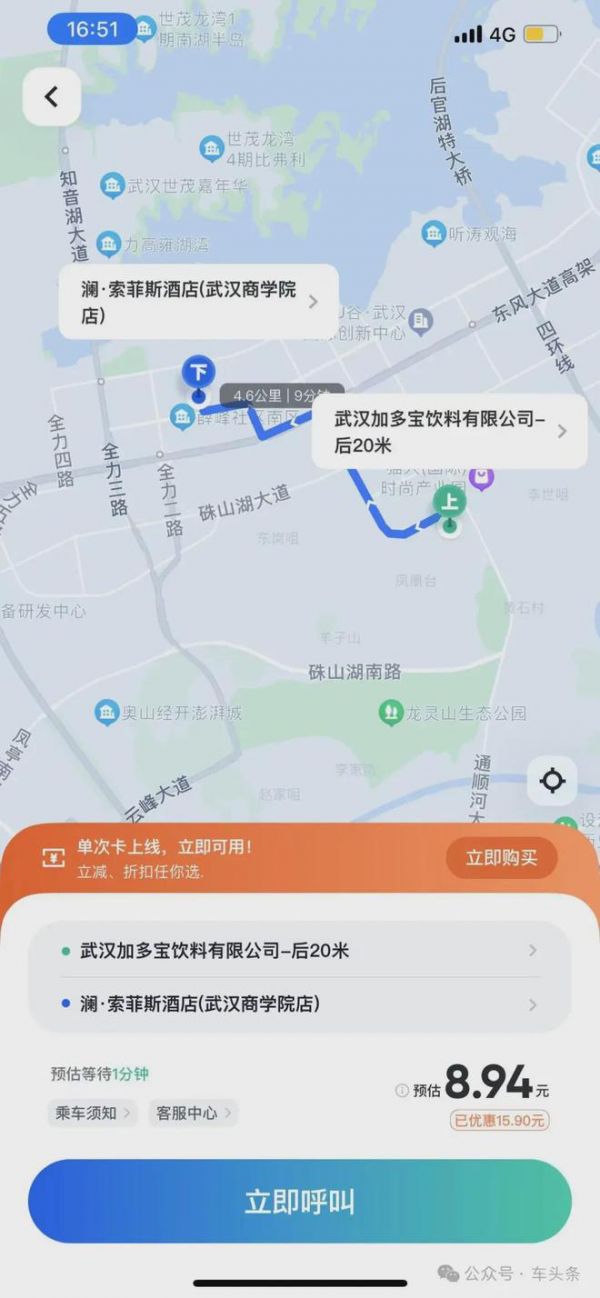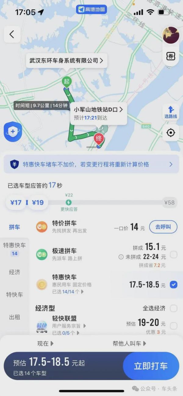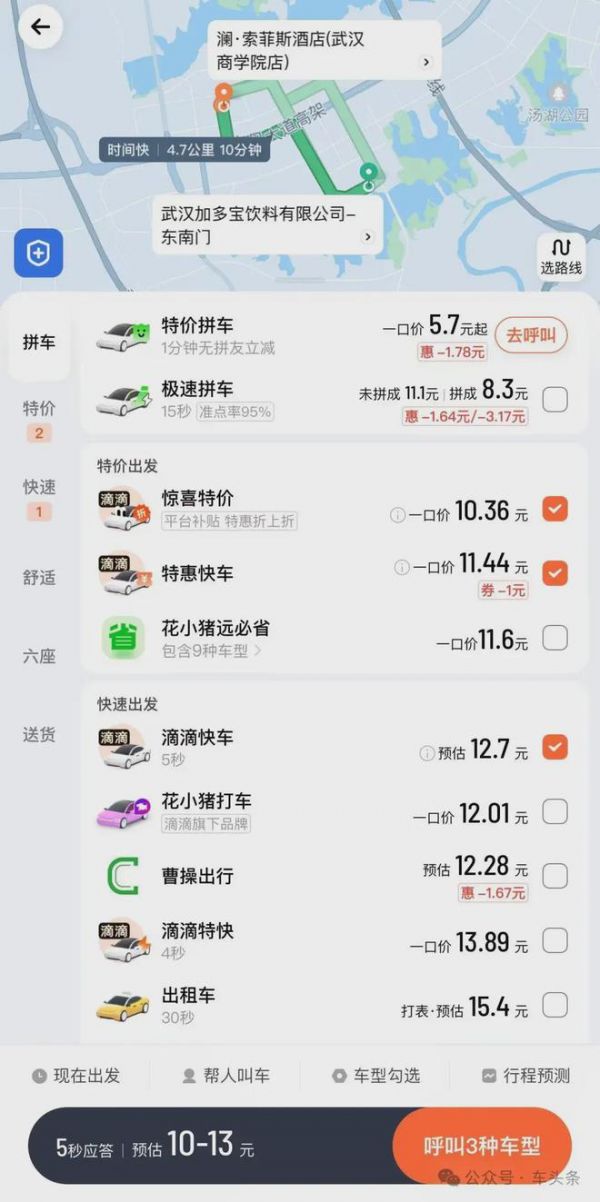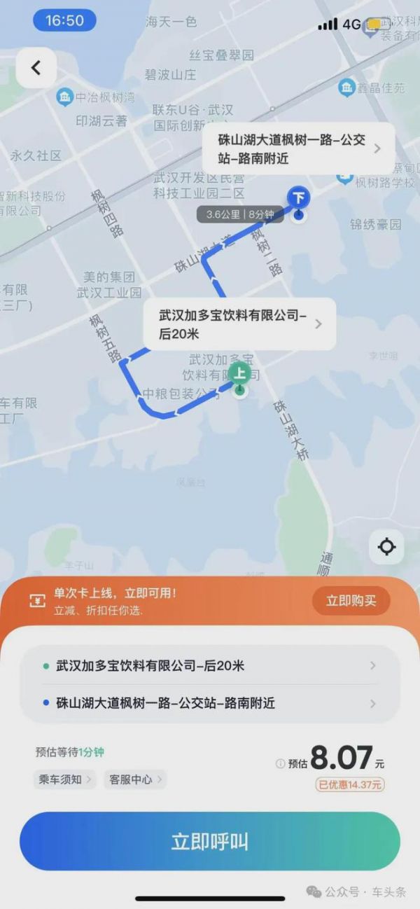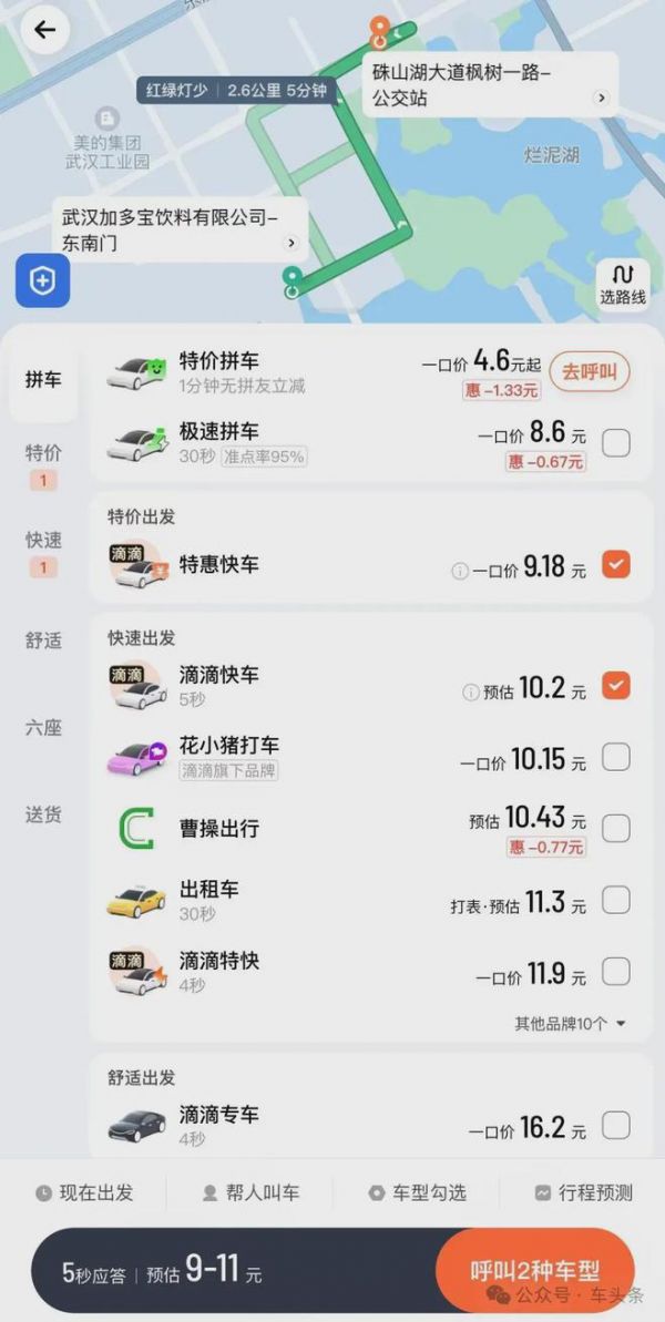 例如,武汉加多宝饮料有限公司——硃山湖大道枫树一路公交站,高德打车路程2.2公里,特惠快车10.1-11元,起步价应该是占了大头的。