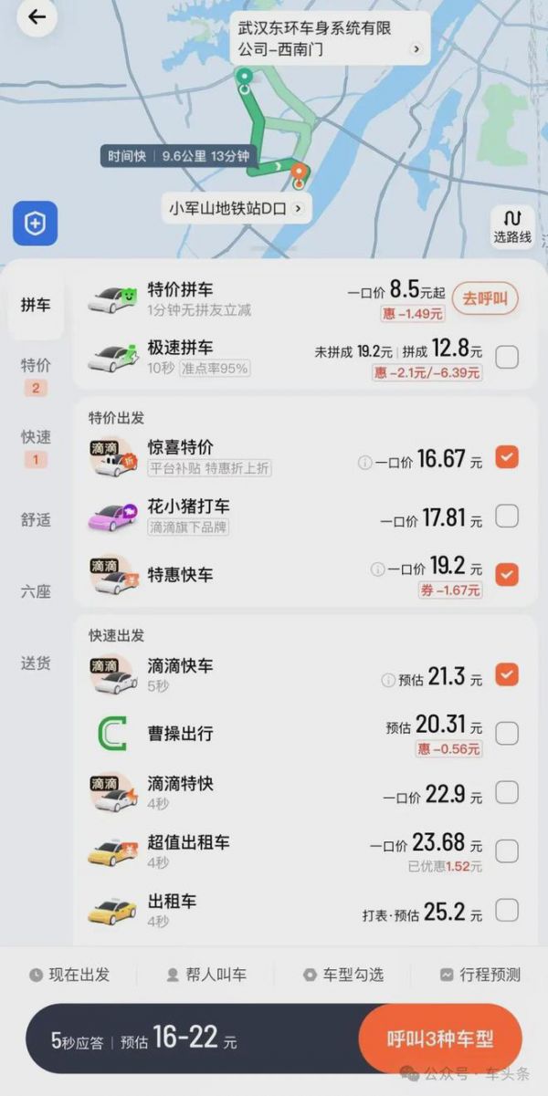 滴滴出行显示总路程9.6公里,行程13分钟。特价拼车8.5元起,极速拼车未拼成19.2元,拼成12.8元,特惠快车19.2元,滴滴快车21.3元。