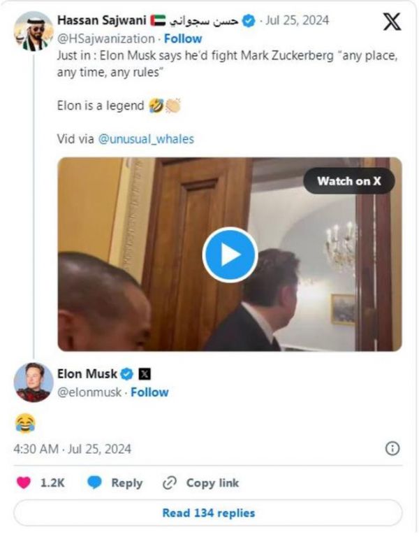 7月25日,据外媒报道,当地时间周三,去年曾向Meta CEO扎克伯格发出笼斗邀约的马斯克,再次向Meta首席执行官马克·扎克伯格发起挑战,声称准备“在任何地点、任何时间、任何规则”下与他战斗。