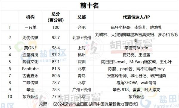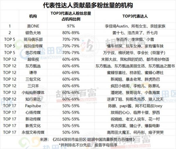 疯狂小杨哥、刘耕宏、李佳琦、贾乃亮、陶白白Sensei等顶流主播的MCN机构三只羊、无忧传媒、美ONE、遥望科技、蜂群文化位列《2024胡润中国流量新势力百强榜》TOP 5。