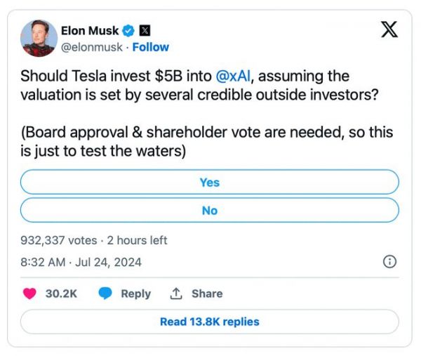 7月25日消息,特斯拉首席执行官埃隆·马斯克(Elon Musk)在社交网络X上发布了一项非正式投票,询问网友是否支持特斯拉向他新创办的人工智能企业xAI投资50亿美元。