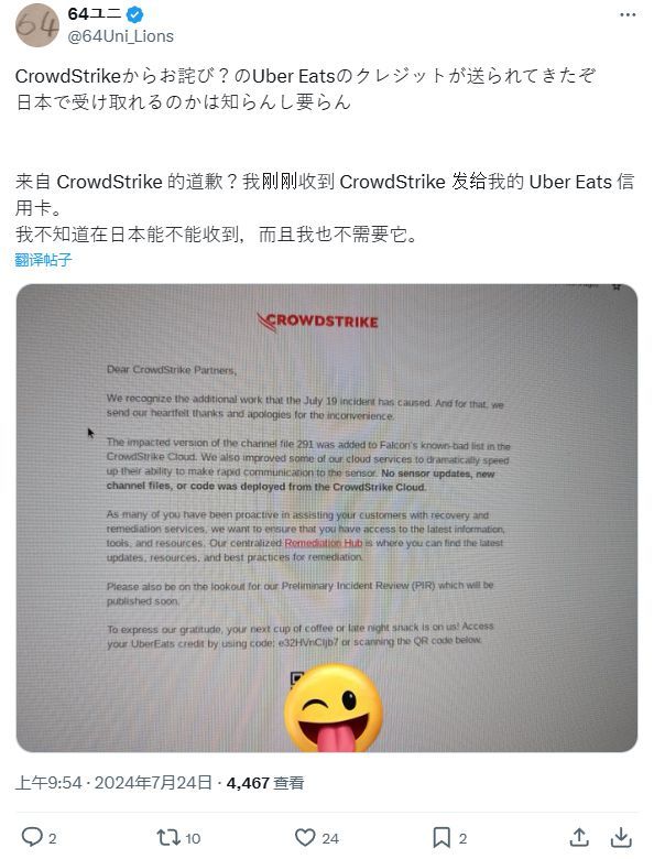 @64Uni_Lions 表示,他刚刚收到 CrowdStrike 首席商务官丹尼尔・伯纳德 (Daniel Bernard) 发送的致歉函,其中还附带了一份价值高达10 美元(IT之家备注:当前约 73 元人民币)的Uber Eats(送餐服务)礼品卡。