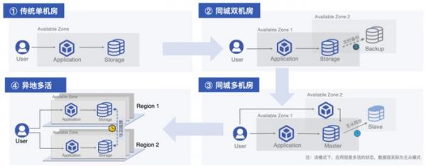 容灾整体的演进过程与大家所理解的基本一致。我们从单一机房开始,逐步发展到同城双机房,再到同城的多个机房。随着业务的快速发展以及部署需求的调整,我们进一步演进到异地多活模式。目前,业界内一些领先的大公司已经实现了相当成熟的异地多活部署模式。
