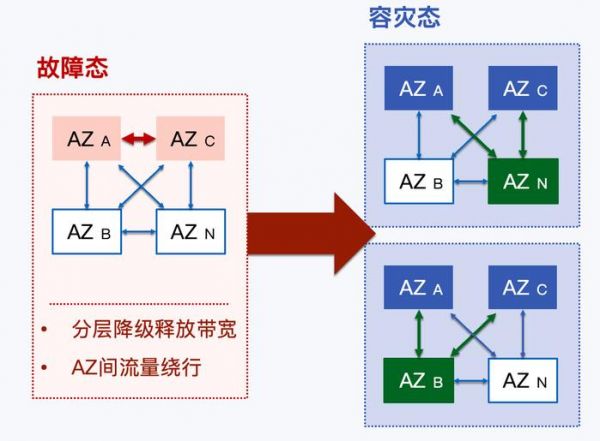 接下来,我会详细讨论专线中断和 AZ 不可用的两个场景下的容灾策略。如果 a 和 c 两个 AZ 之间的专线不可用,我们会选择绕行,绕行基本上是两跳,比如 a 到 n 再到 c,或者 a 到 b 再到 c,这样即使 a 和 c 之间的专线中断,我们的在线服务请求仍然可以触达到目标机房。我们的策略会考虑两个点:分层降级和绕行。我们会先降低离线业务,再是近线业务,然后是部分在线业务,这基于我们的整体优先级;同时,由于降级会带来一定的业务损失,建议在降级前分阶段进行流量观测。绕行时,我们需要提前评估所需的带宽,并考虑绕行后对健康专线容量的影响,以避免对业务造成二次损伤。