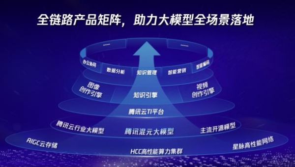 目前,腾讯在大模型领域已经构建了一套全链路产品矩阵,涵盖从底层丰富基础设施到顶层多元智能应用。包括自研通用大模型、模型开发平台、智能体开发平台,以及针对不同场景定制的智能应用解决方案等。通过这些产品和方案,致力于助力企业客户高效地将大模型技术应用到实际业务场景中,实现快速部署和价值创造。