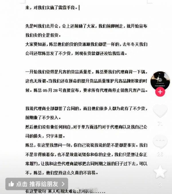 #代理商发文斥凡客CEO毁约# 代理商发文斥凡客过河拆桥,火了以后立刻停止所有代理商销售凡客。CEO陈年回应:正批量投诉冒牌直播间。