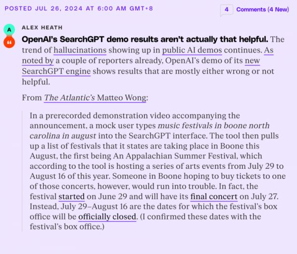 网友评论道,“OpenAI的SearchGPT演示结果实际上并没有那么有用,显示的结果大多是错误的或没有帮助的,公共AI演示中出现幻觉的趋势仍在继续。”