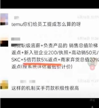 另外,有疑似内部人士透露,Temu员工业绩和商家罚款也有挂钩: