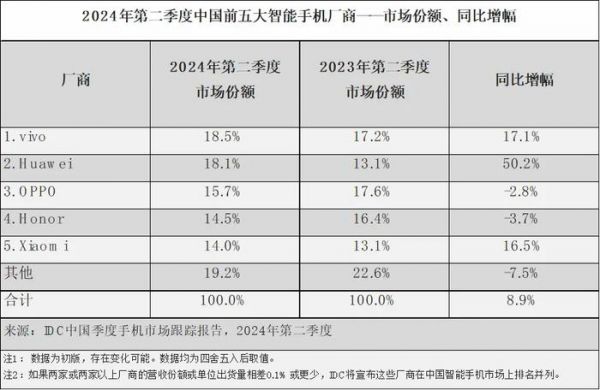 具体到市场份额上,根据IDC数据,中国市场前五名分别是vivo(18.5%)、华为(18.1%)、OPPO(15.7%)、荣耀(14.5%)、小米(14.0%)。
