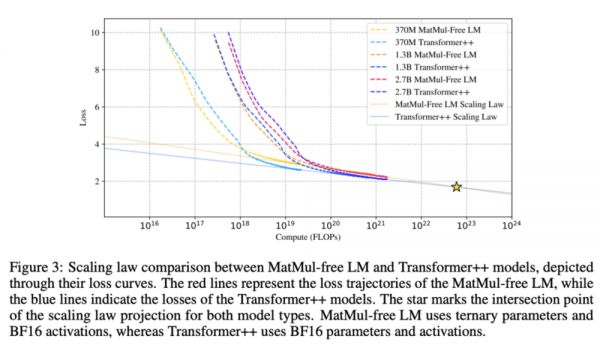 该论文发现,随着模型规模的扩大,无矩阵乘法模型与传统Transformer模型性能之间的差距越来越小,并有可能在超大规模模型上超越后者。来源:Rui-Jie Zhuet.al,Scalable MatMul-free Language Modeling,arxiv.org/pdf/2406.02528
