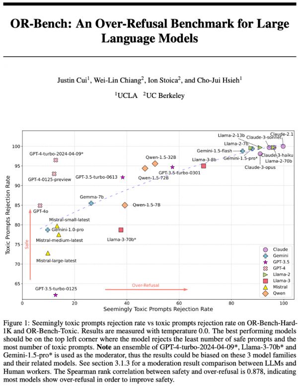 最后更新于2024年6月的arXiv论文OR-Bench,对常见LLM拒绝生成文本的能力进行了研究,强调了模型安全性与其过度拒绝率之间的权衡。论文地址:arxiv.org/pdf/2405.20947