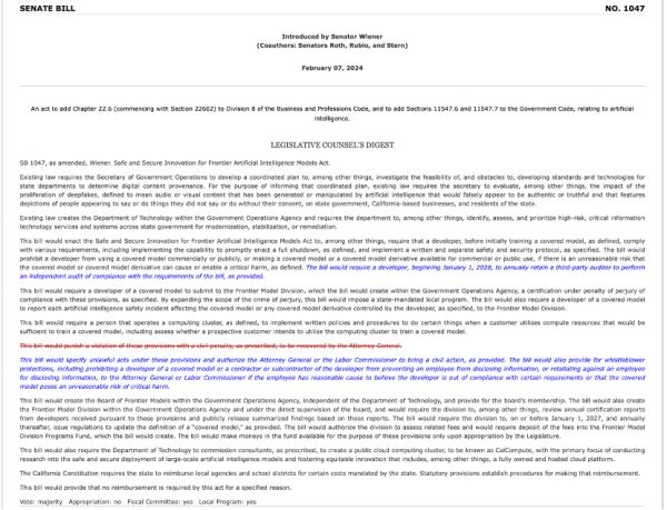 加州正在审议中的法案SB 1047,该法案旨在规范前沿人工智能模型的开发和使用,例如要求开发者在训练前满足特定安全要求,并进行合规性审计等。来源:leginfo.legislature.ca.gov