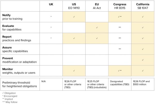 英国、美国、欧盟和美国(包括前述加州法案SB 1047)针对前沿人工智能模型的监管措施对照,用勾号、星号和N/A表示是否强制要求、鼓励或暗示采取相应的监管措施,包括对模型权重和计算能力(FLOP)的要求。来源:Stability AI公共政策专家Ben Brooks@opensauceAI,他曾在GoogleX、Uber和Coinbase等公司工作。