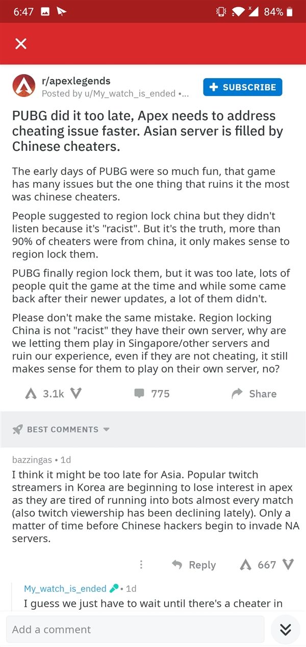 近日外国玩家u/My_watch_is_ended在《Apex英雄》的Reddit论坛发表了一个帖子引起了较大热度的讨论,其希望Respawn能针对外挂采取必要手段,并希望封锁中国区玩家,令之在自己的服务器上玩。