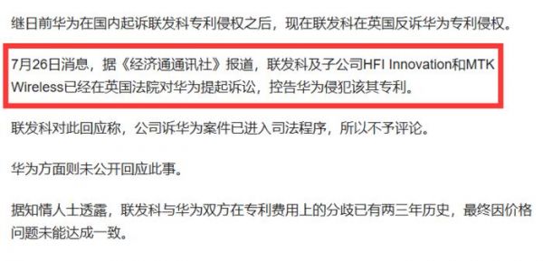 但让人没想到的是,短短几日后,联发科就在英国法院对华为进行了反击,联发科此举或许意味着侵权华为专利属实,准备在专利方面作出一场斗争。
