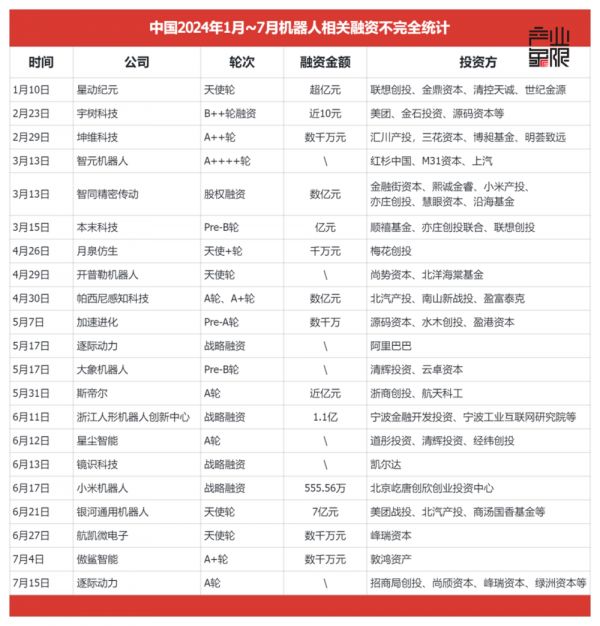 ▲图源:2024年1月~7月机器人相关融资不完全统计,产业象限制图