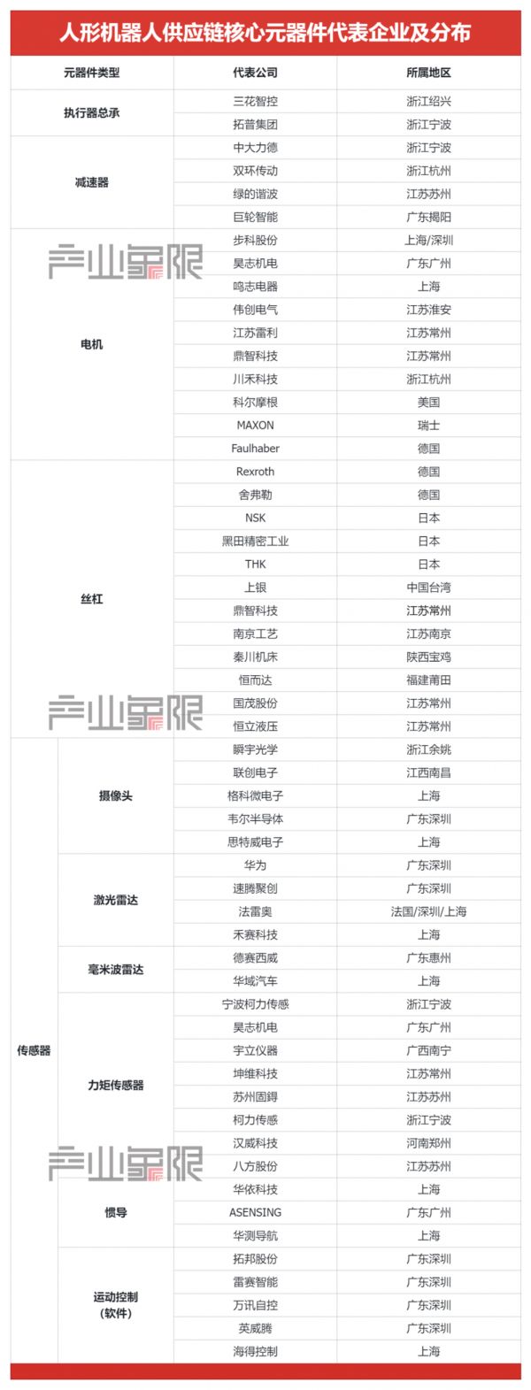 ▲图:人形机器人供应链核心元器件代表企业及分布,产业象限制图