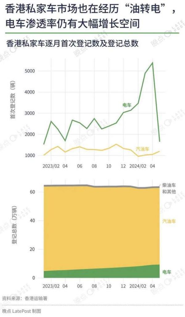 2023 年,在 “一换一” 计划(油车换电车)的加持下,香港的电动车渗透率(约 60%)已经超过了内地(约 30%)。根据运输署的数据显示,2023 年 1-12 月,香港新登记私家车总数达 4.4 万辆,较去年同期(37,478 辆)增长多达 17.85%,其中电动车主导市场,市占率 64.62%,同比升近 12%。