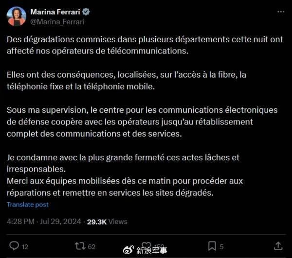 费拉里当地时间29日上午在社交媒体平台X(原推特)发文证实了破坏的发生。她写道:“昨晚在几个部门发生的破坏影响到了我们的电信运营商。这对光纤接入、固定电话和移动电话造成了局部影响。”
