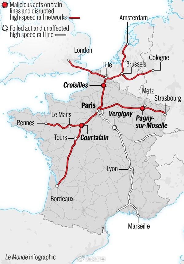 法国国家铁路公司(SNCF)当时通报,25日夜间至26日凌晨,在大西洋、北部和东部三个干线方向的高速铁路附近同时发生纵火等破坏活动,导致铁道信号装置、电缆等设备受损,多条高铁线路中断,列车大规模取消或延误。法国交通部长韦格列特指责,这是针对法国高铁系统的“有组织性恶意攻击行为”。