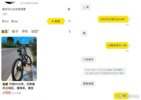 据媒体报道,有重庆用户用户本想买一辆二手捷安特ATX660,就在闲鱼上找到一位卖家,可对方没有介绍有关自行车的相关数据。