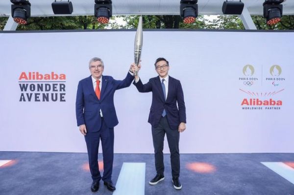 国际奥委会主席巴赫向阿里巴巴集团董事会主席蔡崇信赠送巴黎奥运火炬