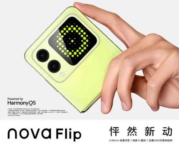 镜头方面,华为nova Flip采用后置双镜头,其中主镜头像素为5000万,并且还显示将支持动态人像和增强光学功能的悬停自拍。
