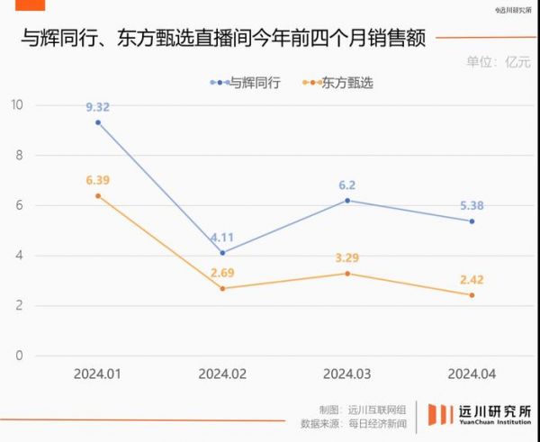 今年前四个月,主营自营商品的东方甄选,销售额始终低于与辉同行。后者直播间以第三方品牌为主,卖的是0.01元的虾片,11.9元的白象酸辣粉,和12元一本的《额尔古纳河右岸》。