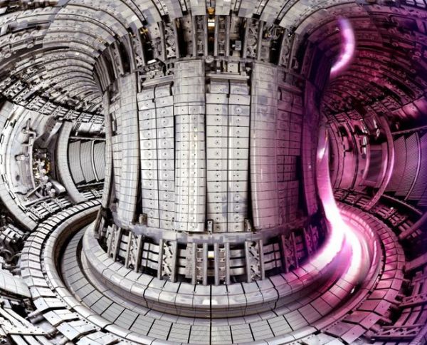 托卡马克装置 JET 的内部构造。托卡马克是 “带有电磁线圈的环形真空室”,名字来自环形(toroidal)、真空室(kamera)、磁(magnit)、 线圈(kotushka)这四个俄语单词的缩写。来源:JET