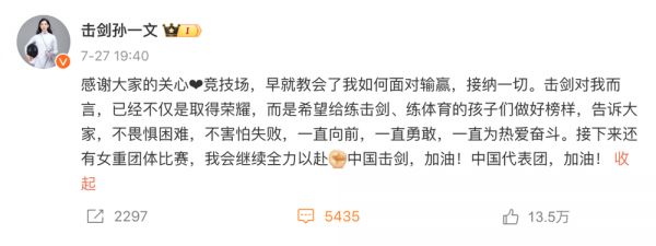 不只是中国体操队与金牌擦肩而过让人痛心,击剑运动员孙一文的遭遇同样充满遗憾。
