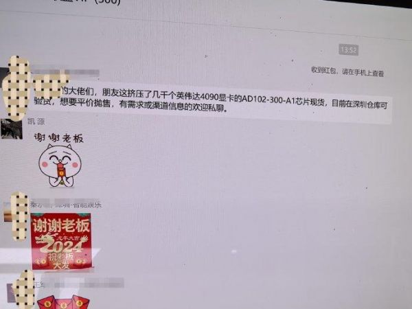 昨天在群里看到有人发这样一条消息,有朋友手里积压了几千个英伟达AD102-300-A1的芯片,希望平价出货。