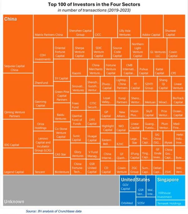 在2019年至2023年间交易数量最多的前10名投资者中,只有一个非中国的投资者:新加坡的高瓴资本(但其创始人张磊本科毕业于中国人民大学),其管理着几所主要美国大学的资产。高瓴完成了133笔交易,集中在人工智能和生物技术领域。
