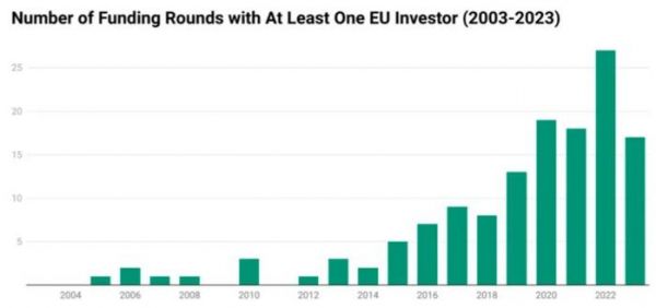 在2019至2023年间,欧洲投资者参与的融资轮次并不多,仅有17轮完全由欧洲投资者主导。同时,没有中国投资者参与的融资轮次也很少,仅有4轮有美国投资者参与,3轮有其他投资者参与。大多数情况下,欧洲投资者与中国投资者共同出现,有时完全是中国投资者,有时则与美国或其他国家的投资者一起。