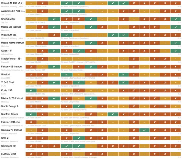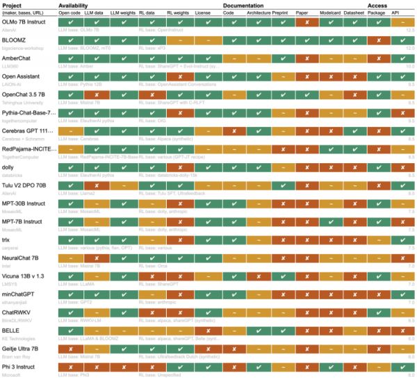 结果显示,项目间差异显著,根据这个排行榜,Allen Institute for AI的OLMo是最开放的开源模型,其次是BigScience的BloomZ,两者都是由非营利组织开发。