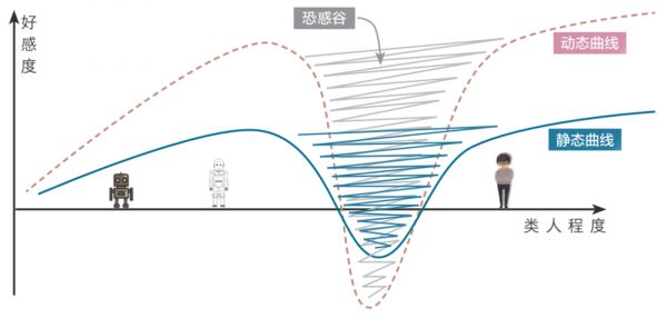 在这条情感变化曲线上出现的低洼段,便被森政弘称为“恐惑谷”,并且他强调,活动的机器人可能会造成更加剧烈的情感反应。