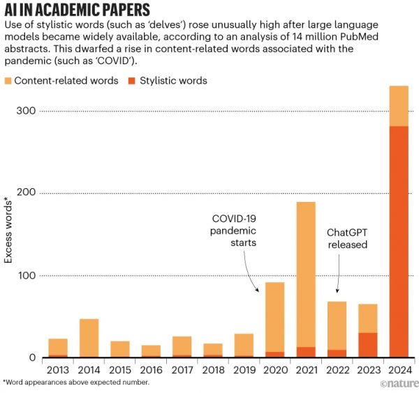 在一篇于 7 月更新的预印本中,研究人员估计,2024 年上半年至少有 10% 的生物医学论文摘要使用了 LLM 进行撰写,相当于每年大约 150000 篇论文。该研究由德国蒂宾根大学数据科学家 Dmitry Kobak 领导,分析了 2010 年至 2024 年 6 月之间在学术数据库 PubMed 上发表的 1400 万篇摘要。他们展示了LLM的出现与风格词汇使用增加有关,例如“delves”、“showcasing”和“underscores”,然后使用这些不寻常的词汇模式来估计使用 AI 处理的摘要比例。他们写道:“基于 LLM 的写作助手的出现在科学文献中产生了前所未有的影响。”