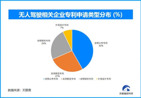 天眼查知识产权信息显示,截至目前,全国范围内无人驾驶领域共产生了14710条专利信息,其中发明公布类专利申请数量最多,占比42%,其次为实用新型专利、发明授权专利和外观设计专利,占比分别为27%、24%和7%,可见技术专利在无人驾驶领域成为重要的专利类型。