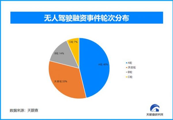 天眼查专业版融资信息显示,截至目前,国内无人驾驶领域共发生融资事件147起。从融资事件轮次来看,A轮融资和天使轮融资占比最高,分别占到了46%和33%;B轮和C轮融资分别占比14%和7%。