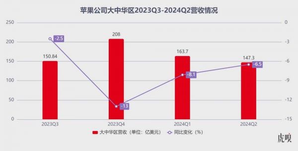 这一连串优异的财务数据几乎全部高于此前市场的一致预期,但有一项数据格外地刺眼:大中华区同比下跌6.5%至147.3亿美元,成为苹果唯一下跌的主要市场。